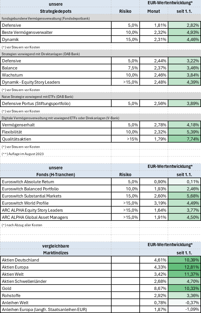 Im Block der traditionellen Engagements ist die Wertentwicklung der Position „Xetra Gold“ mit +8,05 % im Monatsverlauf zu nennen.